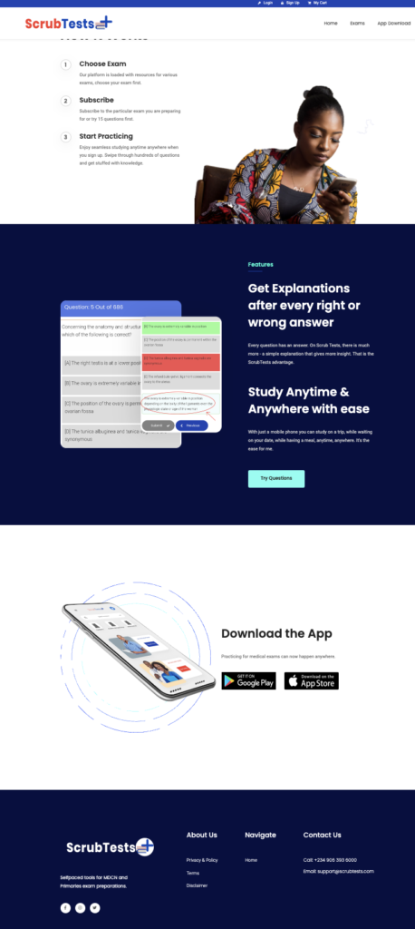 We started work on Scrubtests by putting together researchers to compile question types and answers. Then we also began to design iterations of the Home pages for the website and app (iOS and Android). By being constantly in tandem with the client, we were able to get their idea off the ground. The results; 4000 user signups at launch and an average of 34% increase over the past 2 years post launch.